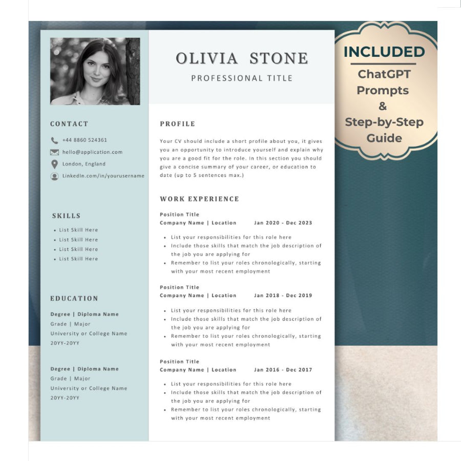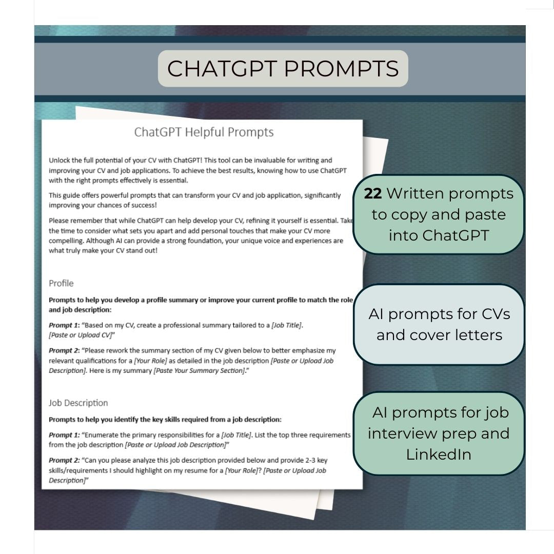 Our expertly designed ChatGPT prompts help you create strong, personalized content for your CV, cover letter, and more. Simply copy, paste, add your details—and let AI do the hard work for you.